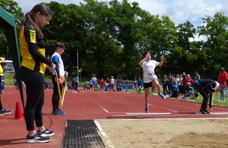 Ein weiteres Highlight war die Weitsprung-Vorführung des TV Mengen. Athlet/innen von der U12 bis zur U20 sprangen um die Wette und wurden dabei lautstark von den Grundschulkindern angefeuert.